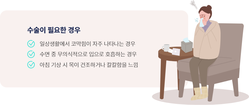 아픈 증상이 자주 발생하는 환자분은 비중격만곡에 대한 수술적 치료를 통해 증상을 크게 개선시킬 수 있습니다.