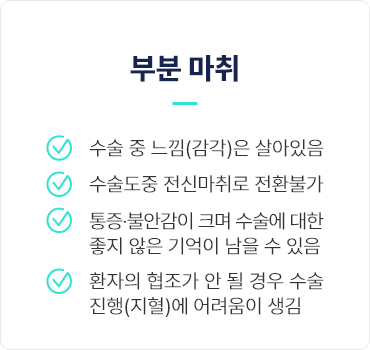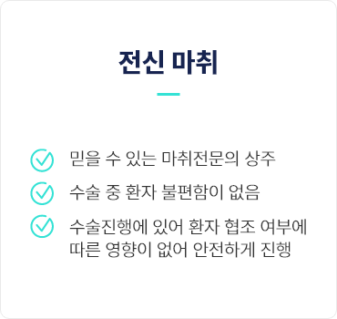 대학병원 출신의 30년 이상 경력의 마취 전문의가 상주하여 전신마취로 수술하고 있습니다.