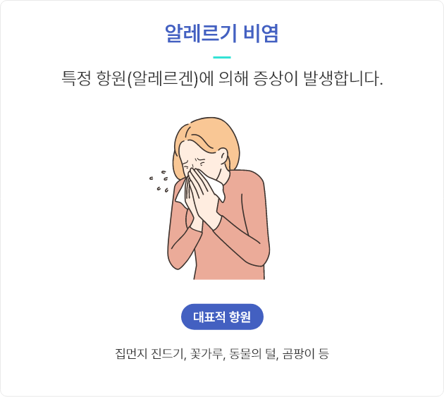 코막힘, 콧물, 재채기, 후비루(콧물이 목 뒤로 넘어가는 현상)